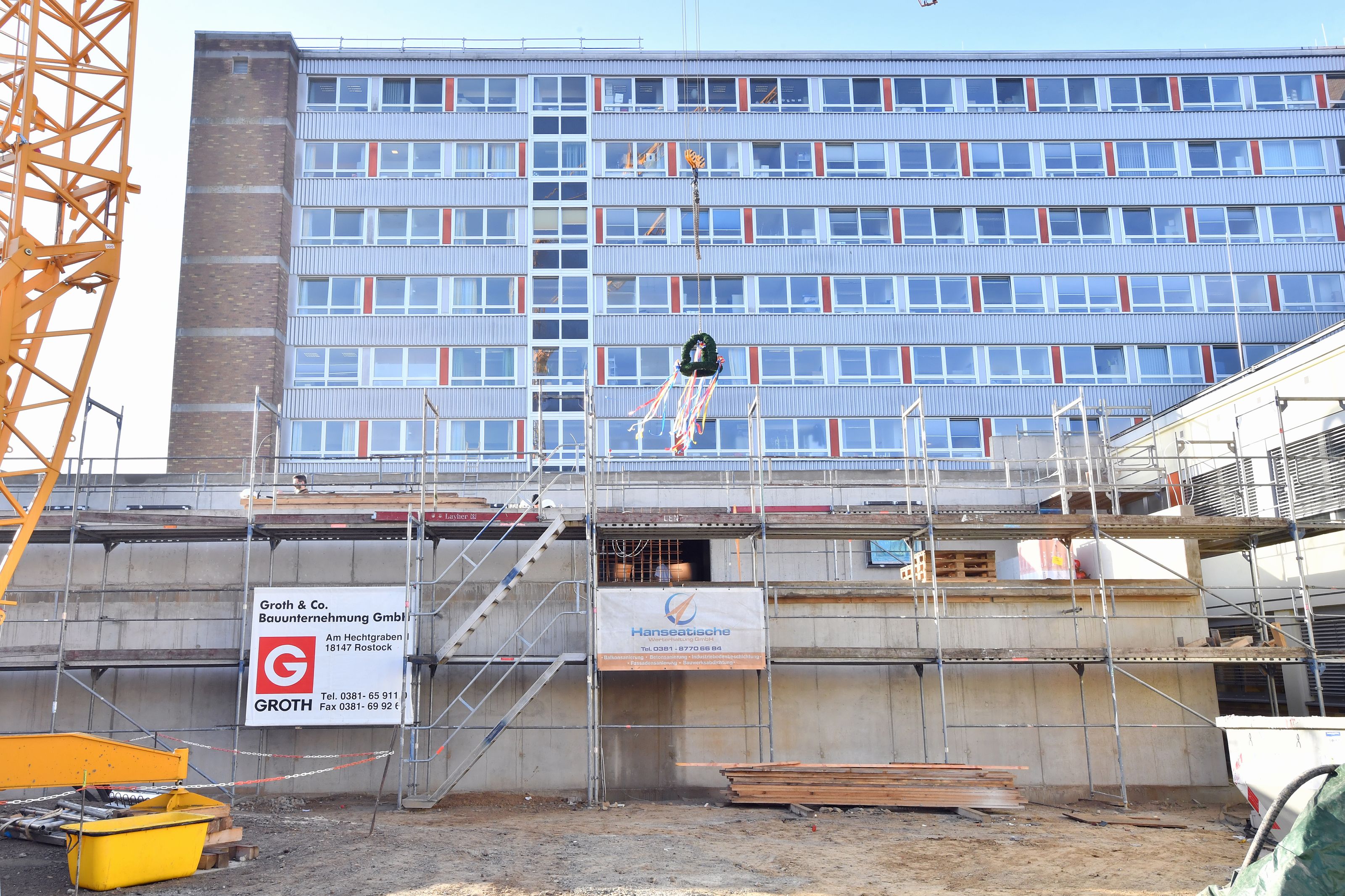 Am Klinikum Südstadt Rostock gab es heute einen Grund zum Feiern – das Richtfest für die erweiterte Notaufnahme und die neue Zentralküche im nordöstlichen Bereich des Haupthauses. Gäste waren die Gesundheitsministerin Stefanie Drese, der Amtierende Oberbürgermeister der Hanse- und Universitätsstadt Rostock, Senator Dr. Chris von Wrycz Rekowski, sowie Vertreter der beteiligten Baufirmen, des Klinikausschusses der Bürgerschaft und viele Mitarbeiter des Klinikums.